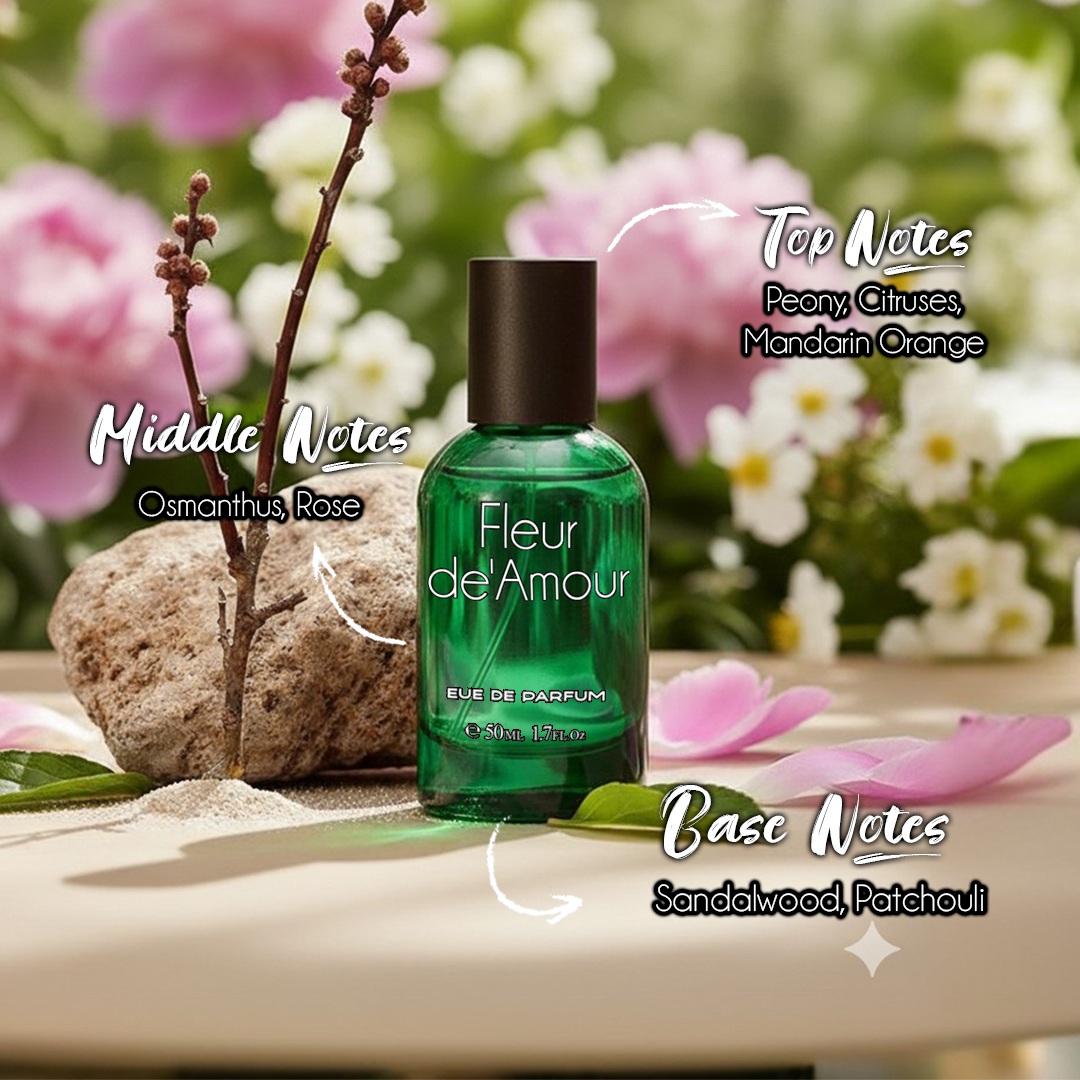 Fleur de’Amour is elegance in bloom. Inspired by Gucci Flora, it opens with a sparkling blend of citrus and peony, lifted by sweet mandarin and fresh greenery. The heart unfolds into a romantic bouquet of rose, osmanthus, and magnolia — delicate yet luminous. Finally, warm sandalwood, patchouli, and musk create a sensual, lasting embrace. Feminine, graceful, and irresistibly charming, Fleur de’Amour is the fragrance of pure romance.