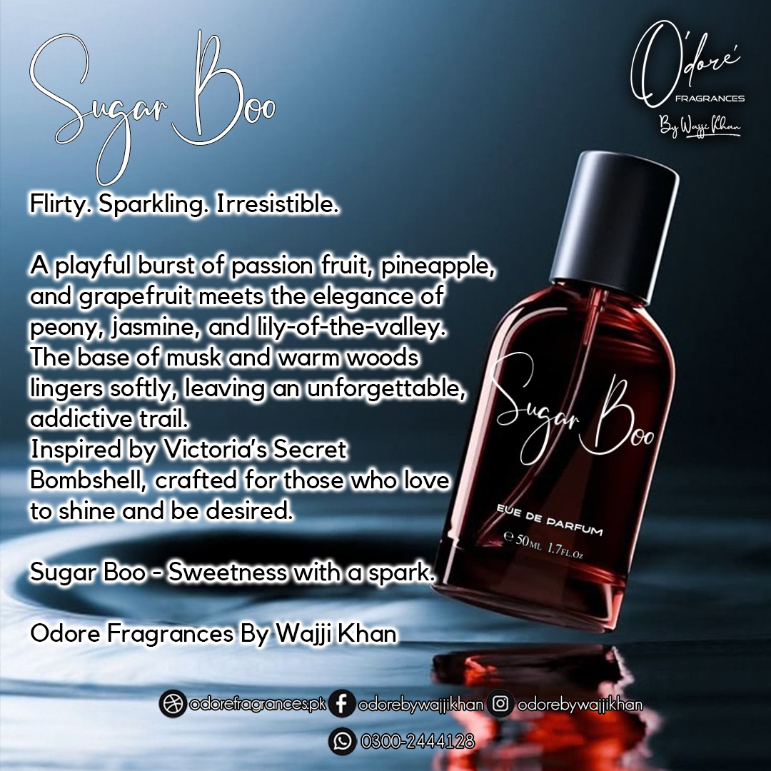 Sugar Boo is sparkling, flirty, and irresistibly fresh. Inspired by Victoria’s Secret Bombshell, it bursts open with juicy passionfruit, grapefruit, and pineapple, creating a bright fruity splash. The heart blooms with peony, jasmine, and lily of the valley for feminine elegance, while a soft base of musk and woods keeps it light, sensual, and lasting. Vibrant, playful, and magnetic — this is the scent of pure confidence and charm.