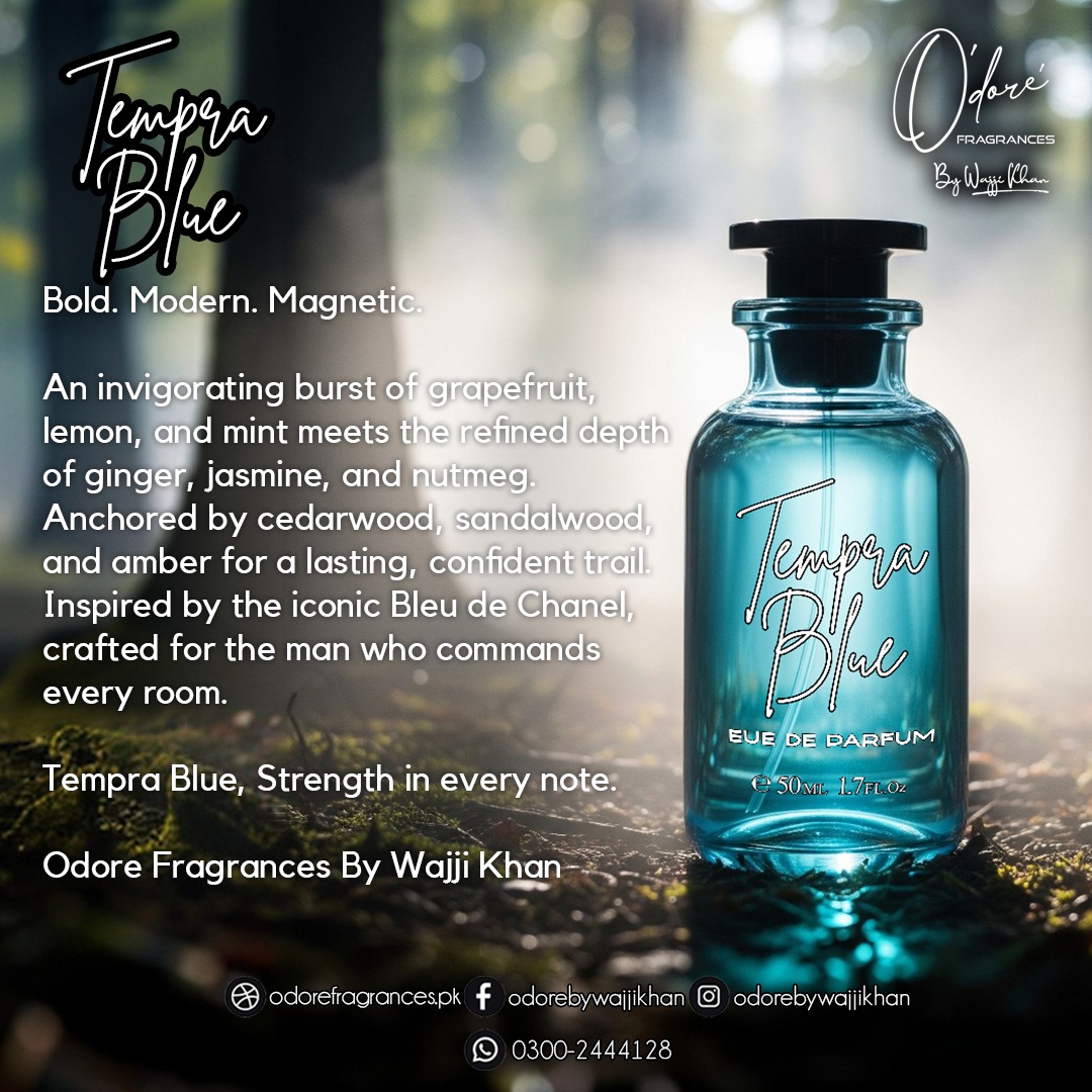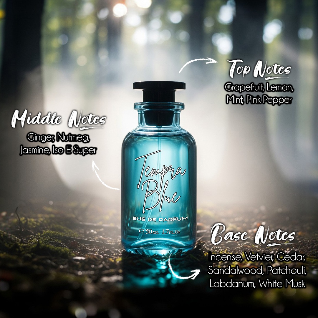 Tempra Blue embodies modern elegance with a refreshing twist. Inspired by Bleu de Chanel, it opens with zesty citrus and aromatic spices, layered over crisp aquatic notes. The heart reveals cedar and subtle ginger, while amber, sandalwood, and musk create a lasting, sophisticated finish. A timeless scent for the man who commands respect effortlessly.